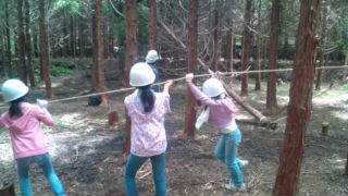 みずがきランドにいます。間伐体験をしています。ノコギリが終わり最後の仕上げです。みんなで引っ張って木を倒しました。11:10