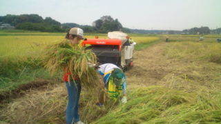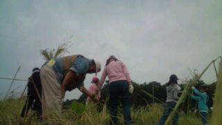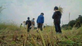 5年生が東松山の田んぼにいます。稲刈りが進み、終盤にさしかかりました。12:10