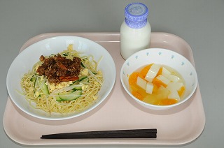 ジャージャ麺は中国の北京あたりの家庭料理です。よく混ぜてから食べてください。