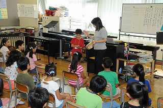 山のポルカのリズムに乗って、子どもと先生がタンブリンとカスタネットで音の掛け合いをしています。