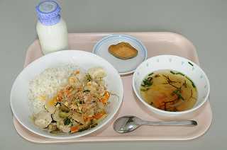 今日は沖縄県の郷土料理です。ゴーヤは夏にとれる野菜です。よく苦みを抜いて食べやすくしました。また、サーターアンダギーは沖縄のドーナツです。黒糖の風味がおいしいですよ。