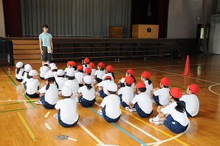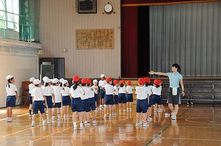 今日は体育館でボール投げの運動をします。まず整列をしています。