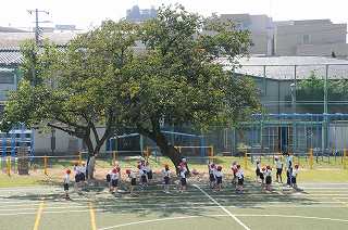 校庭での体育です。準備運動の後、ジャングルジムや登り棒などを使って運動しました。