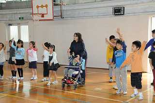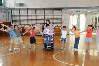 21日に連合運動会に参加するわかたけ学級と、その応援に行く2年生が輪になり、合同でダンスの練習をしています。