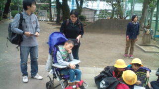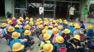 1年生が多摩川台公園へ遠足に行きます。学校の昇降口前に集まり出発式を行っています。8:40