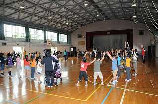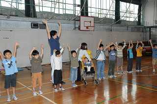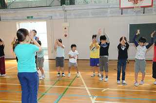21日に連合運動会に参加するわかたけ学級と、その応援に行く2年生が輪になり、合同でダンスの練習をしています。