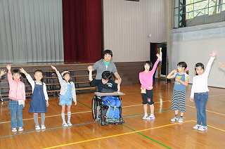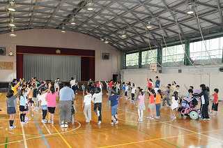 21日に連合運動会に参加するわかたけ学級と、その応援に行く2年生が輪になり、合同でダンスの練習をしています。