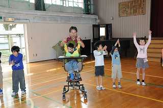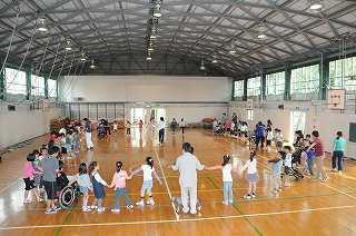 21日に連合運動会に参加するわかたけ学級と、その応援に行く2年生が輪になり、合同でダンスの練習をしています。