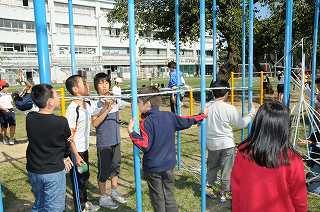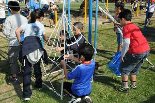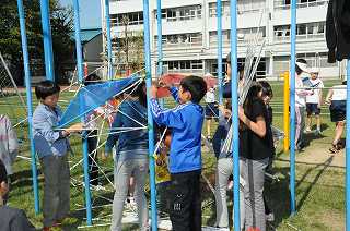 登り棒を利用して、新聞紙を使ったオブジェを制作中です。