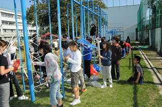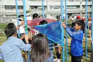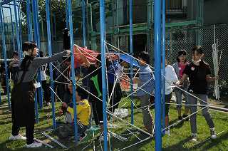登り棒を利用して、新聞紙を使ったオブジェを制作中です。