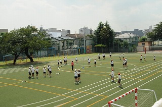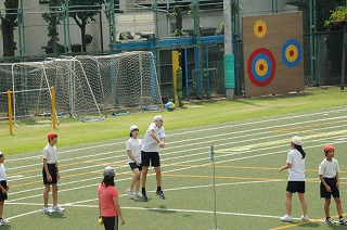 校庭でソフトバレーボ−ルの練習をしています。