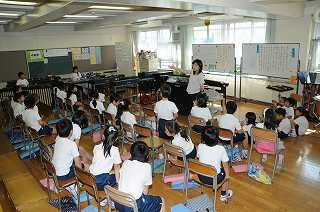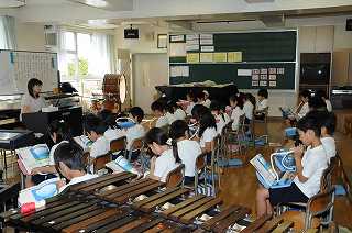 友だちの演奏を聴いての感想を発表しています。その後、鍵盤ハーモニカの練習をしました。