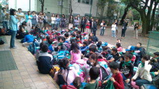 おはようございます。子どもたちが集まり出発式をしています。このあと、学校を出発します。7:30