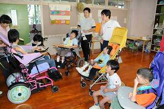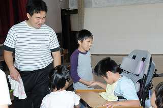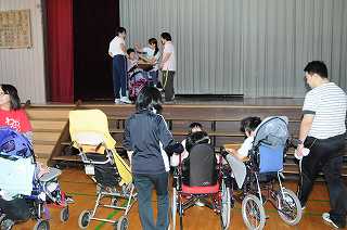 終業式が行われる体育館へ向かいます。体育館についた後、児童代表の担当になった6年生を応援しています。そのあとで、体育館に集まってきた子どもたちとしばらく遊びました。