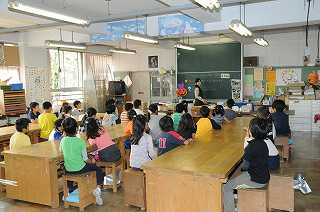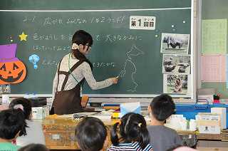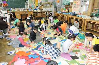 大きい紙に、自由な形に切った色紙を貼り付け大きな絵を描いています。