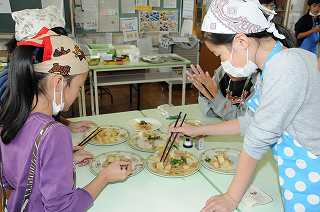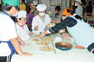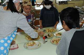 できあがったおかずを盛りつけています。
