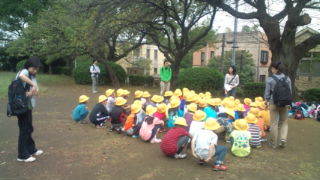 1年生が多摩川台公園にいます。お昼ご飯を食べるために集合しました。11:30