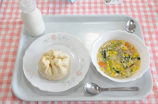 今日の肉まんは、生地から給食室で作りました。生地をのばして肉を包んで蒸しました。肉まんは中国のメニューです。朝早くから働く人たちが、朝食前の軽い食事として食べたところから生まれたそうです。