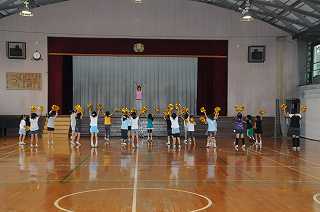 明日の住区まつりで出場するチアリーディングチームが、練習をしています。
