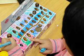 先日、林試の森公園でひろってきたどんぐりで工作を作っています。