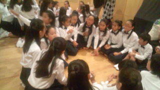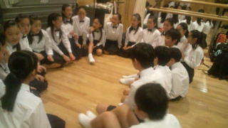 パーシモンホールにいます。今日は合唱団がファミリーオペラコンサートに参加します。開演前にみんなで話し合い、心の準備をしています。