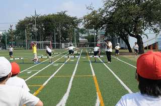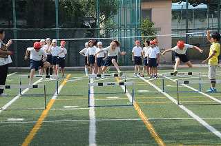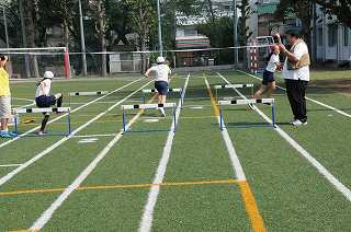 低い姿勢でハードルを跳び越す練習をしています。