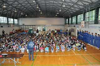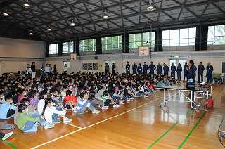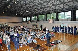 防災訓練を行う体育館に、防災ずきんをかぶり避難するという想定で入場しました。