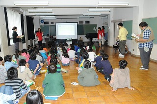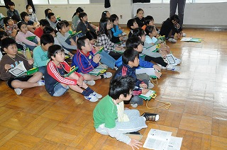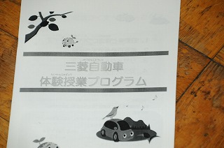 今日は三菱自動車の方に来ていただき、体験授業プログラムで自動車について学びます。まずプログラムの進め方の説明を聞いています。