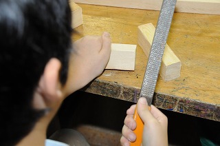 図工で、木を使って「やさしい形、あたたかい形」を作っています。