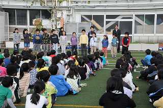 各学級で考えたクラス目標を、代表児童が発表しています。