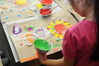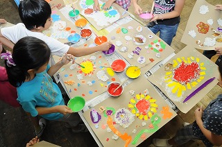 きれいな色の作品を作っています。よく見ると、落ち葉も使われています。