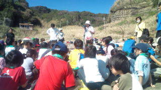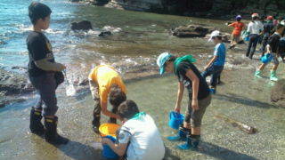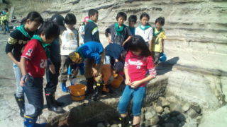 毛戸浦にいます。楽しかった磯観察が終わりました。生き物を海にかえしています。11:30