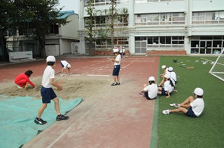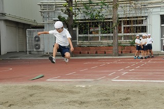 走り幅跳びの記録を測定しています。