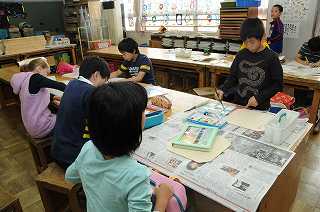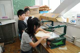 みんなの連絡版を作っています。約束を守って糸のこを使い形を作っています。