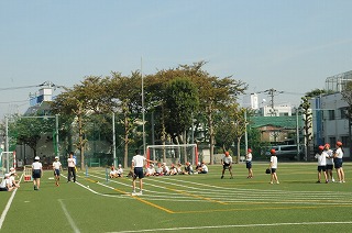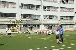 今日の体育はティーボールです。健康トレーナーも支援しています。