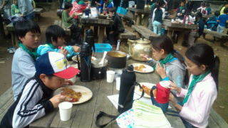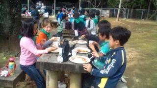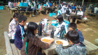 内浦山県民の森にいます。カレー作りが始まりました。作業分担をして進めています。盛り付けをした班から食べ始めました。11:10