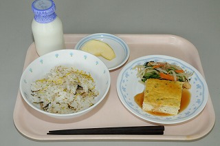明日は文化の日です。秋の香りを楽しんでもらいたいと思い、秋の花、菊をご飯に炊き込みました。菊は食べるために育てられました。色や香りを味わってください。