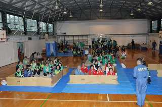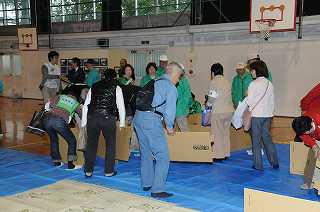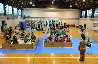 油面小学校避難所運営訓練が始まりました。まず皆さんで、段ボールを使って仕切りを作りました。