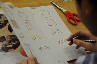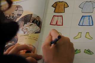 英語ノートを使い、英語で指示された色を洋服に塗っています。