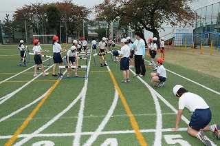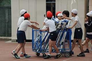 ハードル走の準備を、みんなで協力しながら行っています。