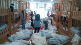 興津の宿舎にいます。各部屋で協力してシーツをかけています。15:40