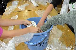 「たのしいともだち」というテーマて、シュレッダーで切った紙とかさ袋を使って人形を作ります。