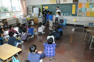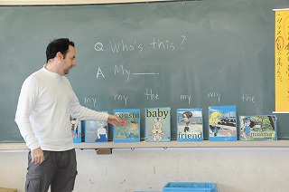 英語の問題にカードを使って答えています。