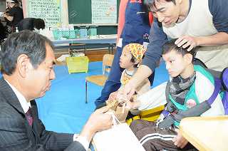 餅つきが終わり、最後は終わりの会です。担当の子どもが自分の仕事をしています。