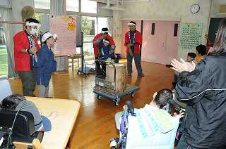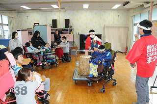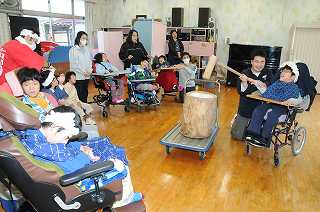 餅つきブラザーズの見本演技の後で、みんなで餅をつく練習をしました。
