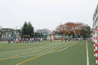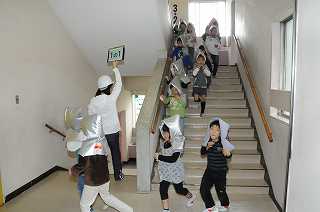 避難訓練の放送終了後、すぐに校庭に避難する行動に移りました。