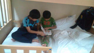 宿舎にいます。就寝前の準備が終わった部屋は本を読んだり、話をしたりしています。20:50