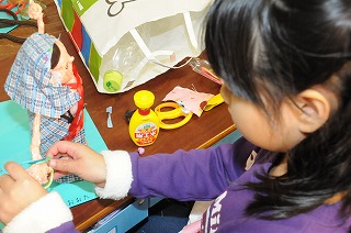 服を着せた人形に、今日は髪の毛やぼうしを付けています。