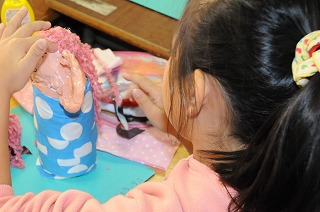 服を着せた人形に、今日は髪の毛やぼうしを付けています。