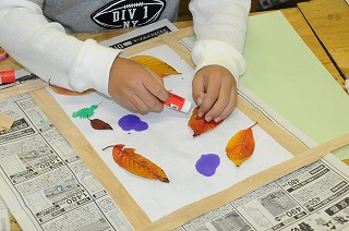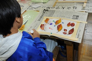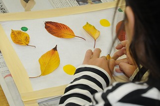 校庭の落ち葉を和紙に散りばめ、秋を表現しています。